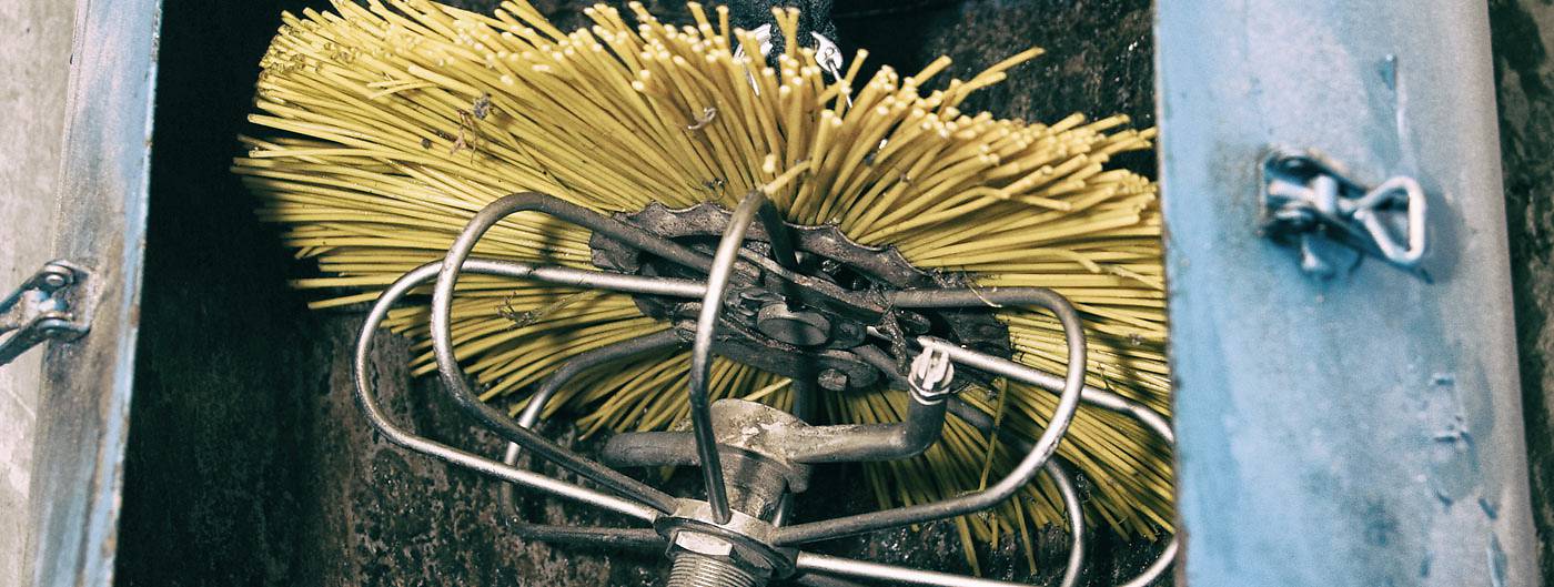 Når vi kommer ud til ejendommen, har vi medbragt vores specialudstyr, som er en lang sonde med børster og to roterende dysser. Vi starter med at køre sonden et par gange op og ned i skakten, mens dysserne sprøjter en bakteriedræbende væske rundt på siderne. Børsterne sørger for, at væsken bliver skrubbet godt og grundigt rundt.
